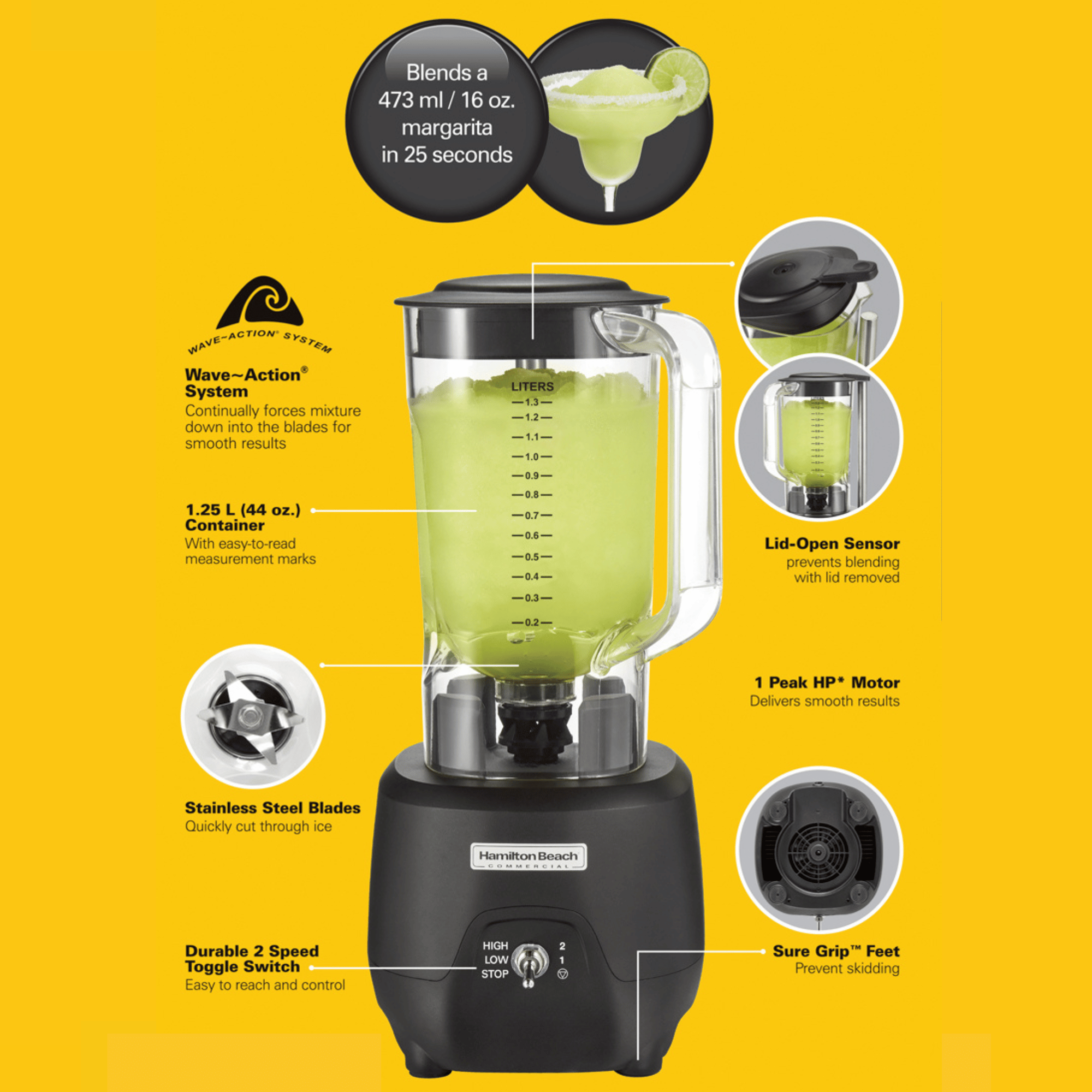 The 908R Bar Blender is ideal for small to mid-sized venues where quick, consistent blending makes a real difference. Its Wave-Action system helps you achieve smooth margaritas in about 25 seconds, boosting service speed during peak hours. The two-speed control supports both rapid batch prep and more controlled textures for signature drinks, while the safety features and sturdy construction offer reliable operation day after day. This is a practical, professional bartender blender that delivers dependable performance without unnecessary complexity, helping staff focus on crafting great cocktails and delivering a seamless guest experience. Images in the gallery illustrate the jug options, blade assembly, and safety features to help you evaluate the unit at a glance.