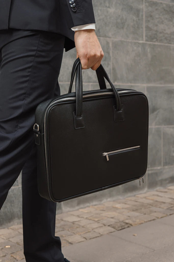 This briefcase not only shields your device but also supports responsible manufacturing. The extra-wide opening makes packing effortless, while the combination of sturdy handles and a cushioned, adjustable strap offers comfort during long days on the move. Whether you’re commuting to the office, heading to back-to-back meetings, or traveling for business, this bag keeps your laptop secure and your essentials organized in a refined, trustworthy package.